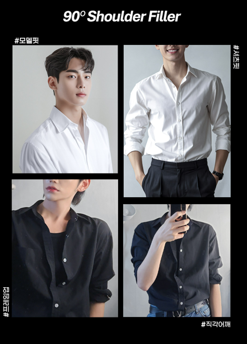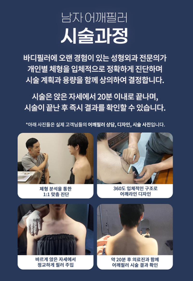 남자 어깨필러란? 직각어깨 만드는 방법 정리 최근 남성분들 사이에서도 체형과 라인에 대한 관심이 높아지면서 남자 어깨필러에 대한 문의가 점점 늘어나고 있습니다. 특히 어깨가 좁아 보이는 경우, 승모근이 발달해 둥글게 보이는 경우, 직각어깨 라인을 원하는 경우 보다 또렷한 어깨라인을 위해 시술을 고민하는 경우가 많습니다. 오늘은 남자 어깨필러란 무엇인지, 직각어깨를 만드는 방법까지 자세히 알아보겠습니다. 남자 어깨필러란? 남자 어깨필러는 어깨 부위에 필러를 주입하여 볼륨을 보완하고 라인을 정리하는 시술입니다. 단순히 크기를 키우는 것이 아니라 어깨의 각도를 보완하여 직각어깨 느낌을 만드는 데 목적이 있습니다. 직각어깨가 중요한 이유는? 직각어깨는 단순히 어깨가 넓어 보이는 것을 넘어 전체적인 인상과 비율에 영향을 줄 수 있습니다. 어깨가 넓어 보이는 효과, 상체가 균형 잡혀 보이는 느낌, 얼굴이 작아 보이는 효과 특히 남성의 경우 체형 이미지를 좌우하는 요소로 작용하기도 합니다. 남자 어깨필러 효과는? 개인 차이는 있지만 다음과 같은 변화를 기대하는 경우가 많습니다. 1. 어깨라인 개선 : 둥글게 떨어지는 어깨를 보다 각진 라인으로 보완 2. 직각어깨 연출 : 어깨 바깥쪽 볼륨을 보완하여 자연스러운 직각 느낌 형성 3. 상체 비율 개선 : 어깨가 넓어 보이면서 얼굴이 상대적으로 작아 보이는 효과 4. 체형 보완 효과 : 좁은 어깨나 밋밋한 체형을 보다 균형감 있게 보완 남자 어깨필러 용량은 어느 정도일까요? 어깨는 넓은 부위이기 때문에 얼굴 필러보다 많은 용량이 사용됩니다. 일반적으로 한쪽 기준 20cc ~ 40cc , 양쪽 기준 40cc ~ 80cc 정도가 많이 사용되지만 개인 체형에 따라 달라질 수 있습니다. 남자 어깨필러 이런 경우 고려할 수 있습니다. 1. 어깨가 좁아 보이는 경우 2. 직각어깨 라인을 원하는 경우 3. 상체 비율을 개선하고 싶은 경우 4. 옷 핏을 개선하고 싶은 경우 직각어깨를 만드는 방법은? 남자 어깨라인은 단순히 필러만으로 결정되지 않고 근육 + 볼륨 + 라인을 함께 고려하는 경우가 많습니다. 1. 어깨필러 : 볼륨 보완 및 지각라인 형성 2. 승모근 보톡스 : 과도한 승모근 완화, 어깨를 내려 보이게 하는 효과 3. 지방분해주사(필요 시) : 지방이 많은 경우 라인 정리 이처럼 개인 상태에 따라 시술을 병행하는 경우도 있습니다.