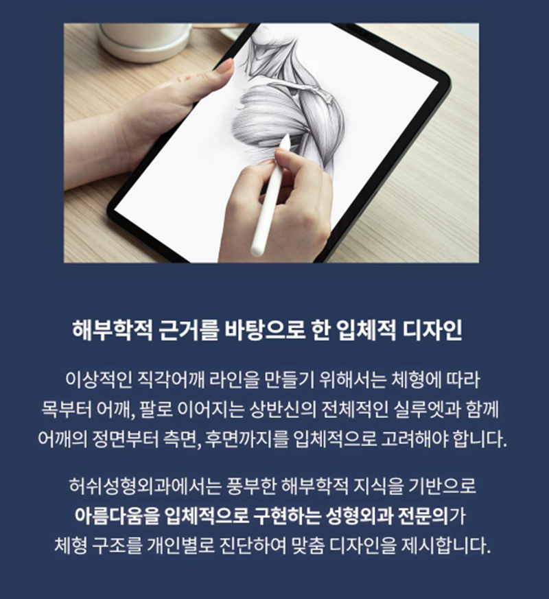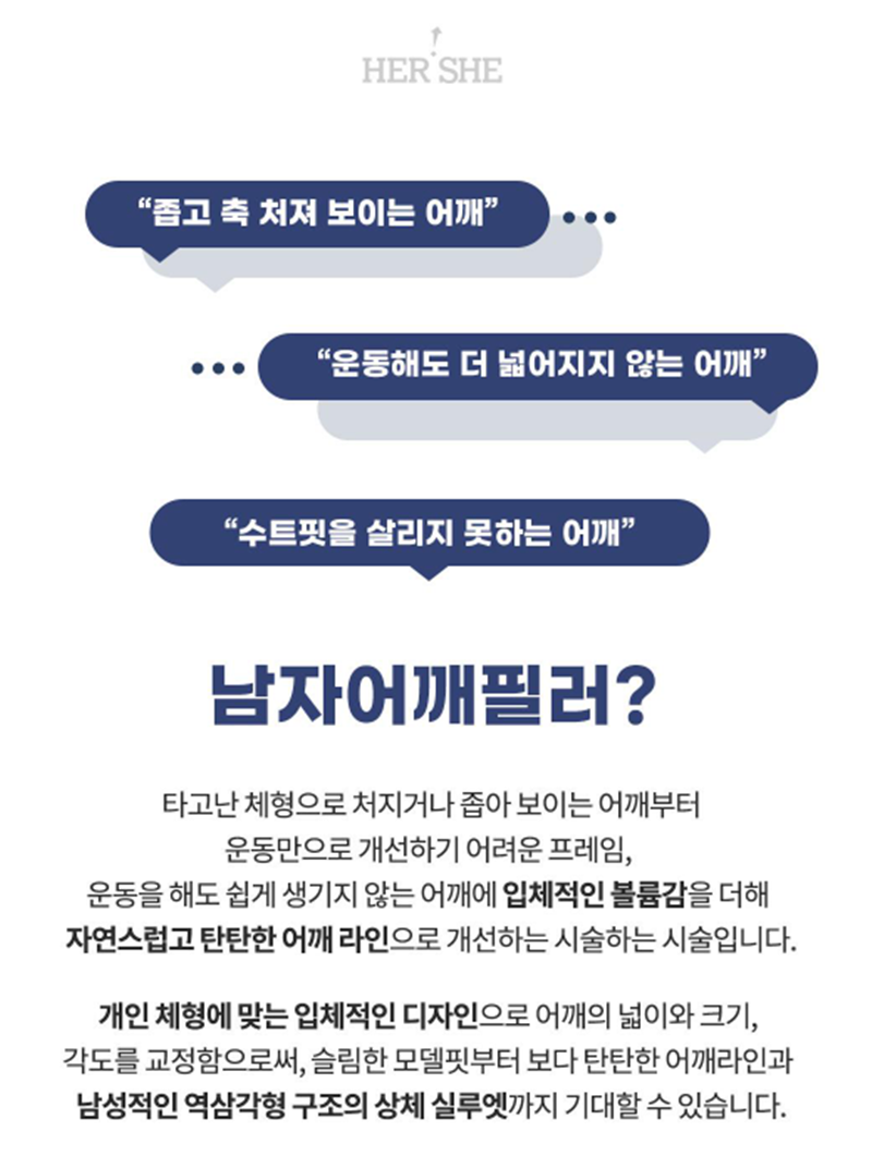 않은 경우 활용됩니다. 남성분들의 경우, 너무 부드러운 곡선보다는 직선적이면서도 탄탄해 보이는 어깨 라인을 원하는 경우가 많습니다.