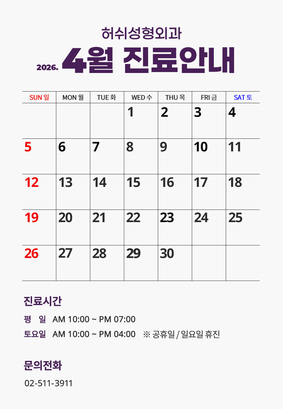 [허쉬성형외과] 2026년 4월 진료일 안내