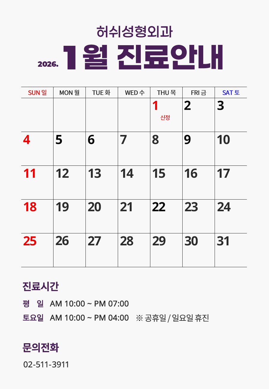 [허쉬성형외과] 2026년 1월 진료일 안내