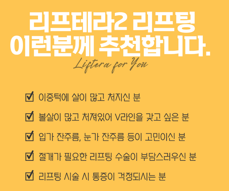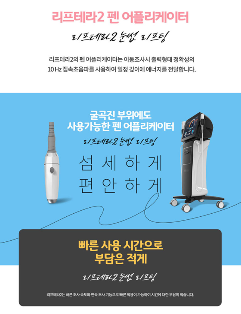 리프테라2, 피부 탄력 관리의 또 다른 선택 오늘은 리프테라2에 대해 간단히 알아보도록 하겠습니다~! 리프테라2는 초음파 리프팅 기기로, 피부 깊숙한 층(SMAS층)에 에너지를 전달해 탄력을 개선하고 처진 피부를 당겨주는 시술입니다. 특징은 정확한 에너지 전달과 세밀한 맞춤 디자인이 가능하다는 점인데, 덕분에 개인의 피부 상태와 고민에 따라 비교적 정교한 시술이 가능합니다.